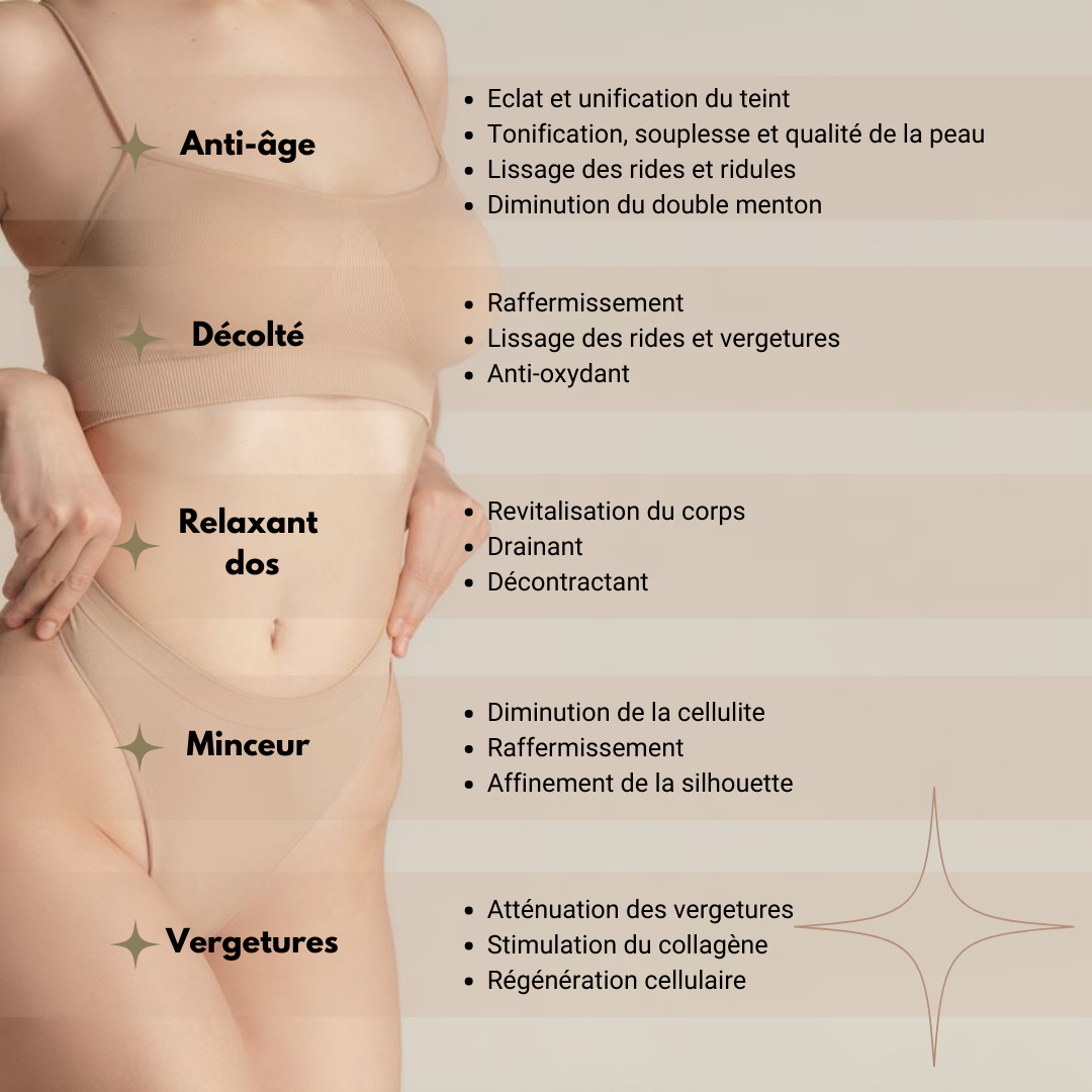 C’est une méthode unique de soins anti-âge et minceur qui traite à la fois le raffermissement, l’amincissement et la qualité de peau.